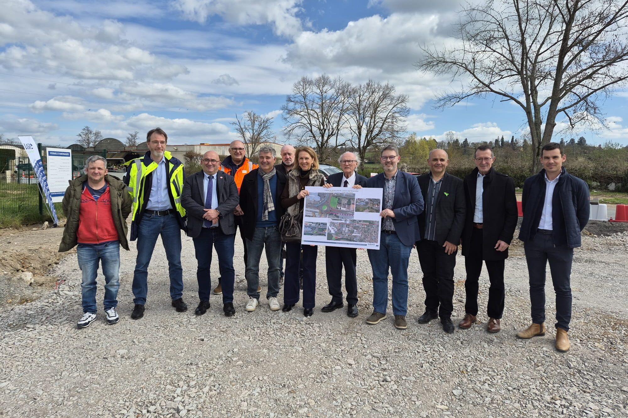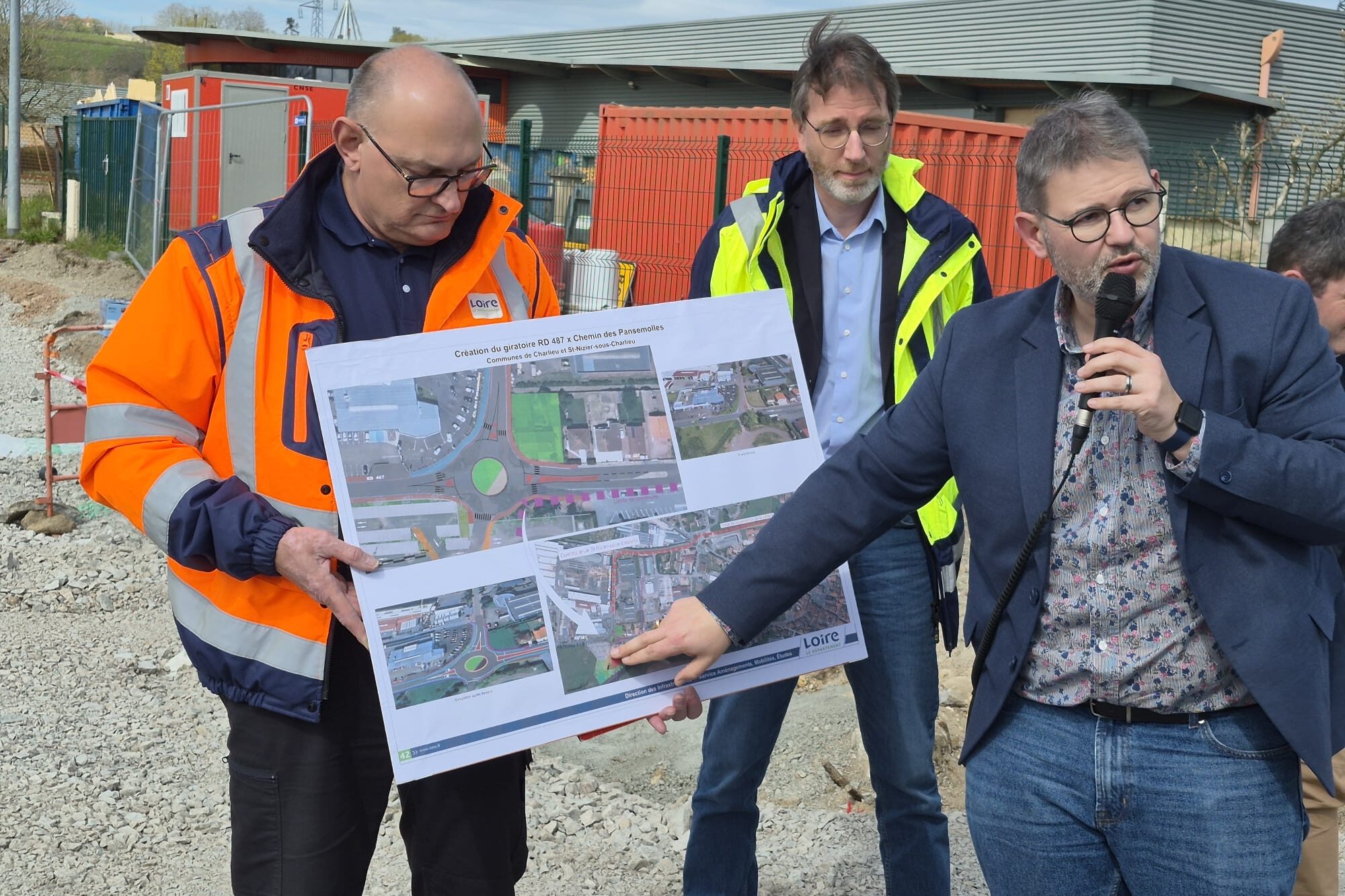 En présence du président Georges Ziegler, les élus du canton de Charlieu, Clotilde Robin et Jérémie Lacroix se sont rendus au lancement de la création du giratoire au carrefour Pansemolles / RD487 sur les communes de Saint Nizier sous Charlieu et Charlieu.